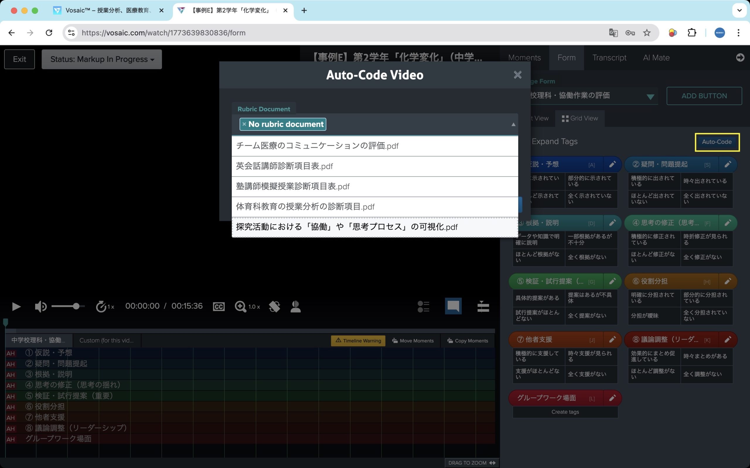 - フォームにある「Auto-Code」のボタンをクリックし、あらかじめPDFドキュメントで登録しているルーブリックを選択します。ここでは「探究活動」に関するルーブリックを選択します。フォームはこのルーブリックから自動で作ったものを使用しています。