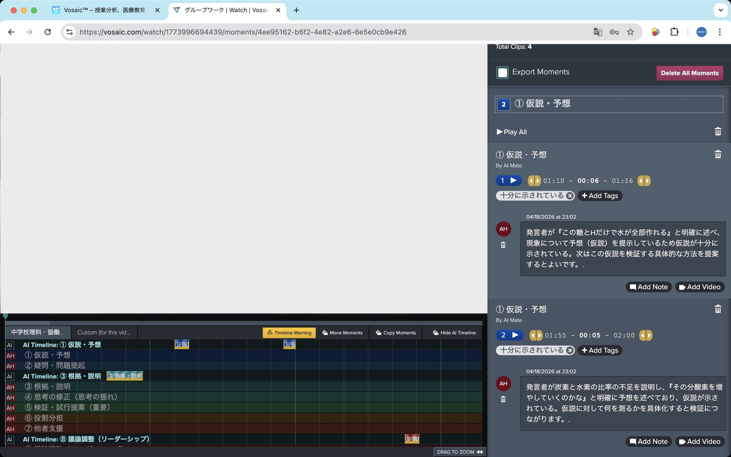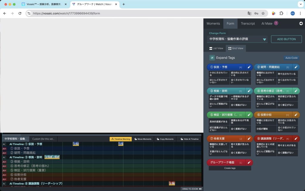 [2026年4月16日]VosaicのAI分析機能(AI Mate)は、先日のマルチモーダル(音声のトランスクリプトとビデオ画像の両方を使用した分析)への対応に続き、タイムラインへの「Auto-Code」(自動タグ付け)の機能を実装しました。ユーザーが診断基準を記したPDFドキュメントと、それに基づいたフォームを利用して、AIが自動的にタイムラインにモーメントを追加します。ここではその手順と例をご紹介します。